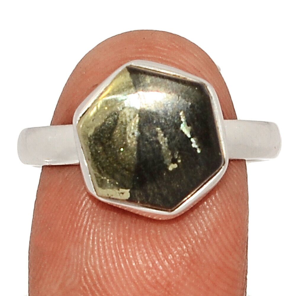 This stylish pyrite ring features a polished pyrite stone set in sleek white metal, creating a modern and eye-catching design. The metallic sheen of the pyrite contrasts beautifully with the cool tone of the white metal, giving the ring a bold yet elegant look.